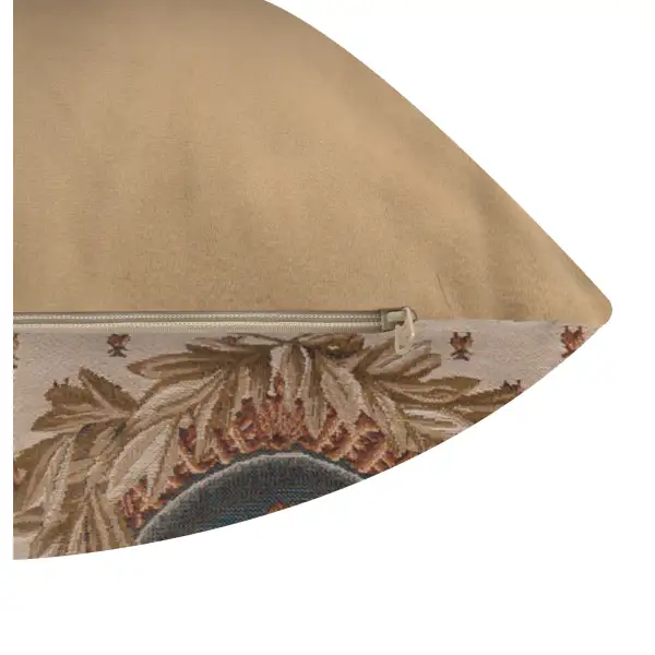 This European jacquard cushion cover features soft earth tones with cool blue accents adding a sophisticated level of subtle nuance to your home decor motif.
