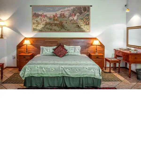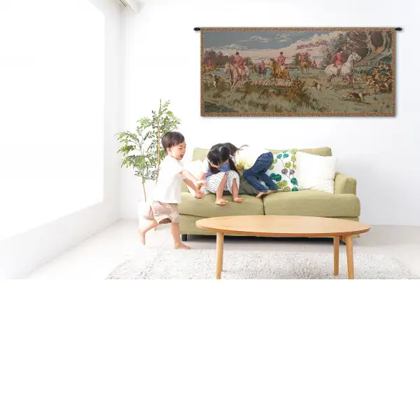 Chasse à courre is a French impressionist jacquard woven tapestry wall hanging inspired by the traditional oil painting and tapestry arts depicting hunting scenes.