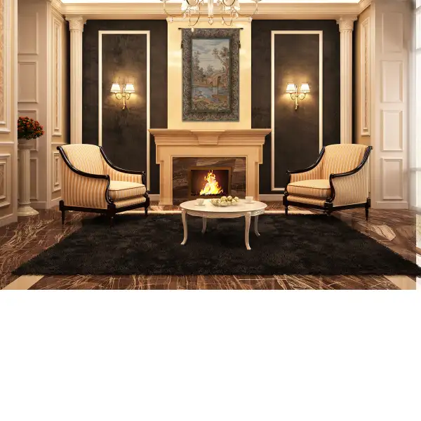 Fishing at the Lake, Vertical is an Italian jacquard wall tapestry. The artwork comes from a series painted by Francois Boucher (1703-1770), and shows a young boy fishing by the lake, a typical pastoral activity reminiscent of the Rococo era.