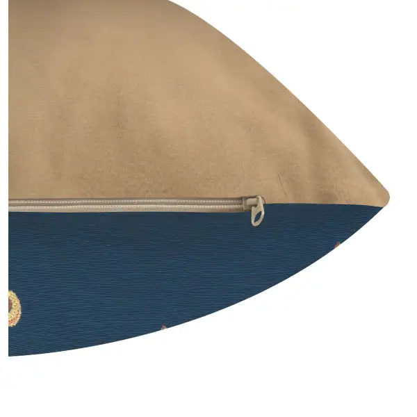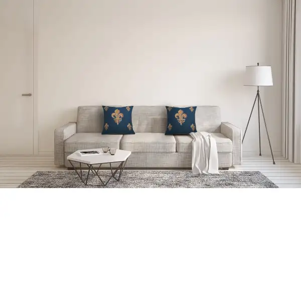 The Five Fleur de Lys Blue tapestry cushion cover is a masterpiece that seamlessly intertwines artistry and symbolism. Woven with precision using the jacquard technique, this opulent tapestry features the iconic Fleur de Lis against a dramatic deep blue background. The central focal point is a larger golden Fleur de Lis, intricately crafted with metallic threads that not only catch but play with light, creating a mesmerizing brilliance. This larger motif is not solitary; it is framed by four smaller Fleur de Lis, one delicately placed in each corner, enhancing the overall composition with heraldic splendor.