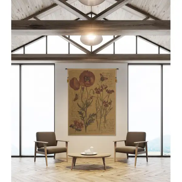 Flanders Poppies Belgian chenille tapestry is reminiscent of a drawing from a medieval herbal, you see the poppy in various stages of its life: just opening on the right; in full bloom in the center; and aging quickly at the bottom left. The Flanders poppy has been the symbol of remembrance and reverence for our war dead since World War I. John McCrae’s poem “In Flanders Fields” so inspired American Moina Michael that she began the tradition of the Flanders Fields Memorial Poppy. Due to her tireless championship, the American Legion adopted the poppy. Madame E. Guérin then took up the campaign internationally and both women are called the “Poppy Lady.”