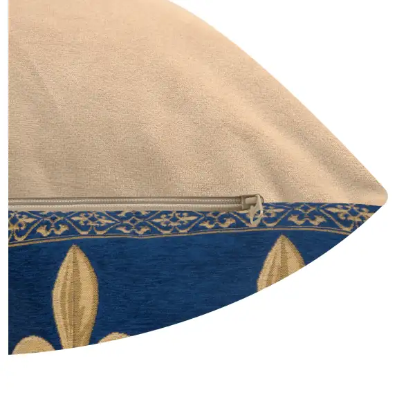 Fleur de Lys Blue II woven European tapestry cushion cover features a background of solid dark blue with three large fleur de lys symbols on the front and an ornate gold border.