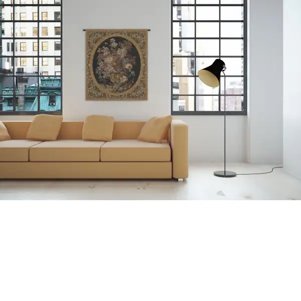 Floral Composition in Vase Black is an Italian jacquard woven wall tapestry. A captivating work featuring an abundance of flowers overflowing onto the table below. The detail of the petals and leaves and the subtle shading is masterfully executed. The use of widely varying colors: crimsons, violet blues, deep orange and olive greens in their variety of shades, to the composition of overlapping flowers with leaves protruding creates a balanced and engaging piece. The ornate border with its scroll and floral motifs complements the floral subject.