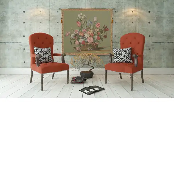 Flower Basket is a Belgian made jacquard woven wall tapestry. This floral still life makes a stunning impression, rich in color and detail. A light background behind a lovely arrangement of boldly colored flowers creates a classic look.