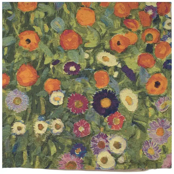 The Flower Garden III cushion cover is a tribute to the legendary Austrian symbolist painter Gustav Klimt, echoing his unmistakable style through a symphony of vibrant hues of oranges, purples, light blues, and creams, meticulously arranged to depict a flourishing garden of colorful blooms contrasted against verdant green foliage. Crafted using jacquard weaving, the cushion cover boasts a luxurious texture and remarkable durability, ensuring both visual appeal and long-lasting quality. Adding to its allure, the cushion cover is luxuriously backed with Belgian velvet, elevating its tactile appeal and lending a sense of opulence to its artistic beauty. The intricate patterns and rich hues add depth and dimension to any space, instantly infusing it with a sense of opulence and artistic flair.