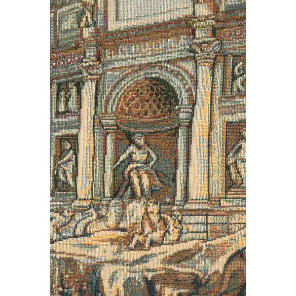 Fontana di Trevi, or The Trevi Fountain, is an Italian jacquard wall tapestry. It portrays the famous Trevi Fountain found the Trevi district in Rome, Italy, designed by Italian architect Nicola Salvi and completed by Pietro Bracci. The backdrop for the fountain is the Palazzo Poli. Taming of the waters is the theme of the gigantic scheme that tumbles forward, mixing water and rockwork, and filling the small square. Tritons guide Oceanus' shell chariot, taming hippocamps.