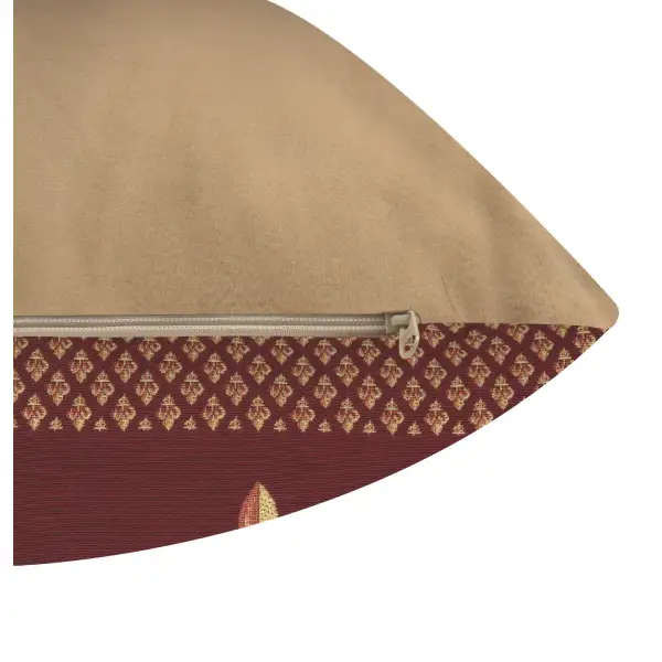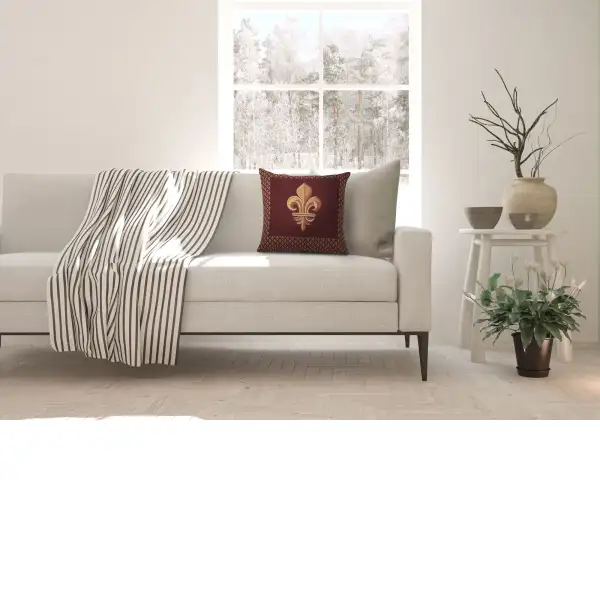 At its center, a golden Fleur de Lis commands attention, woven with metallic threads that catch and reflect light, creating a captivating interplay of brilliance, placed upon a striking deep red background. The intricate detailing extends beyond the central motif, as the cushion cover is framed by a series of smaller Fleur de Lis, evoking a sense of heraldic splendor.