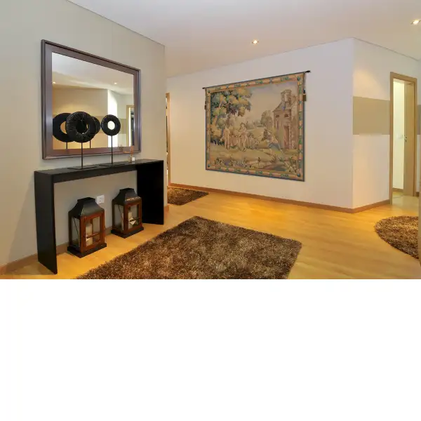 Game is a Belgian made jacquard wall art tapestry. This idyllic country scene focuses attention on an important game of bowling, while the flag flying from the roof illustrates the festivity of the occasion. The portrayal of games in tapestries was traditionally a popular way of remembering special occasions and happy times.