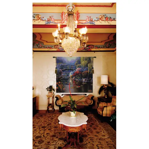 Giverny Pond is a jacquard woven tapestry depicting a beautiful landscape with a pond, weeping willow trees, various flora, and a classical bridge crossing. This is a stunning piece that holds the implication of romance between every woven thread. A fine addition to your home decor motif.