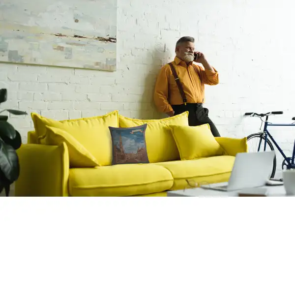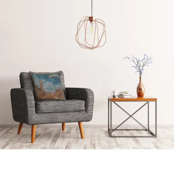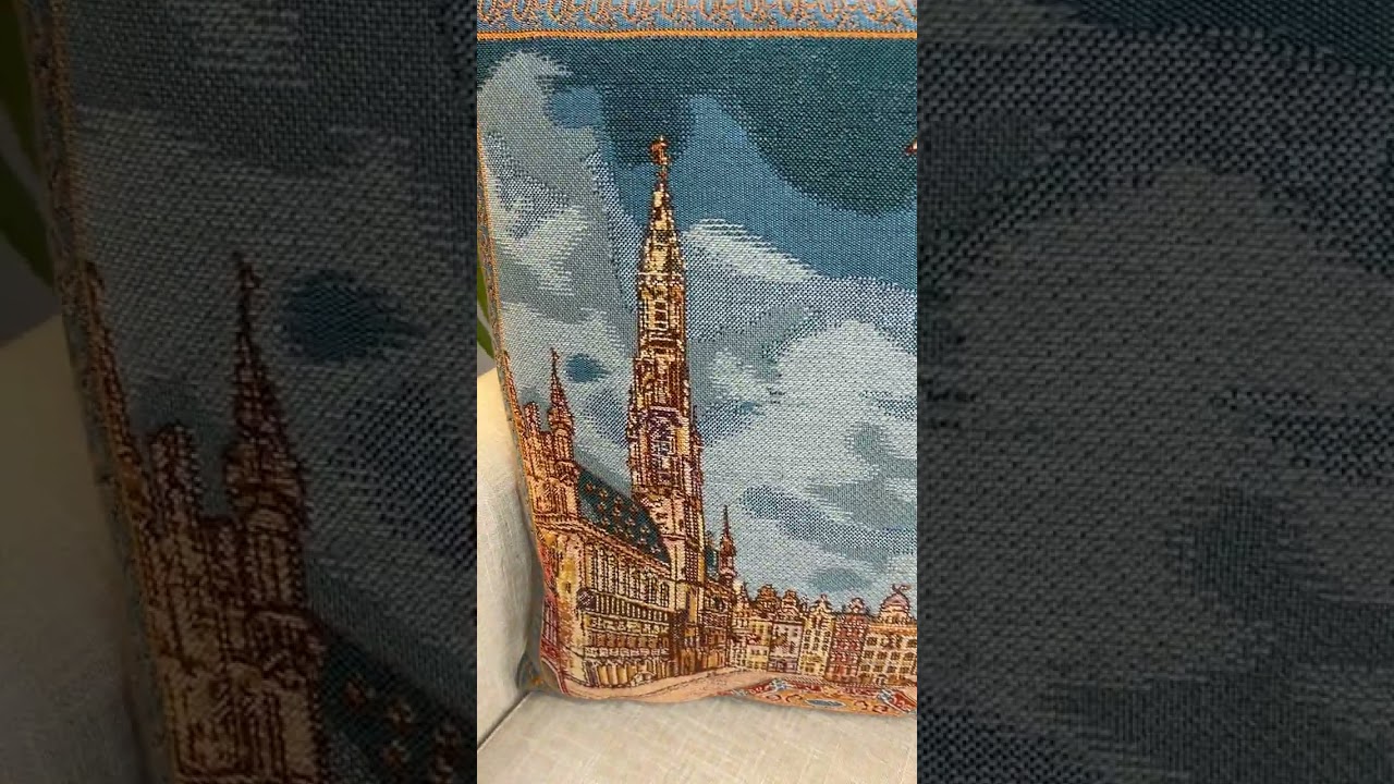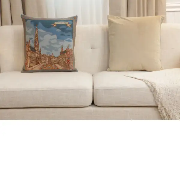 Grand Place Brussels I Belgian tapestry cushion cover shows the town hall in Brussels, Belgium.