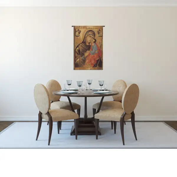 Greek Madonna is an Italian jacquard woven wall tapestry. For over a thousand years, through the Byzantine, Medieval and Early Renaissance periods the Madonna was the most often produced pictorial artwork. Many specific images of the Madonna, both painted and sculptured, have achieved fame, either as objects of religious veneration or for their intrinsic artistic qualities.