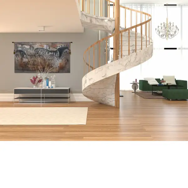 Hands and Horses is a Belgian wall tapestry. This famous composition from the Pech-Merle Cave at Cabrerets, France depicts two near life-size dappled horses, and is a fine example of art from the stone age. It has been dated 25000 B.P. A fine accent to your home décor.