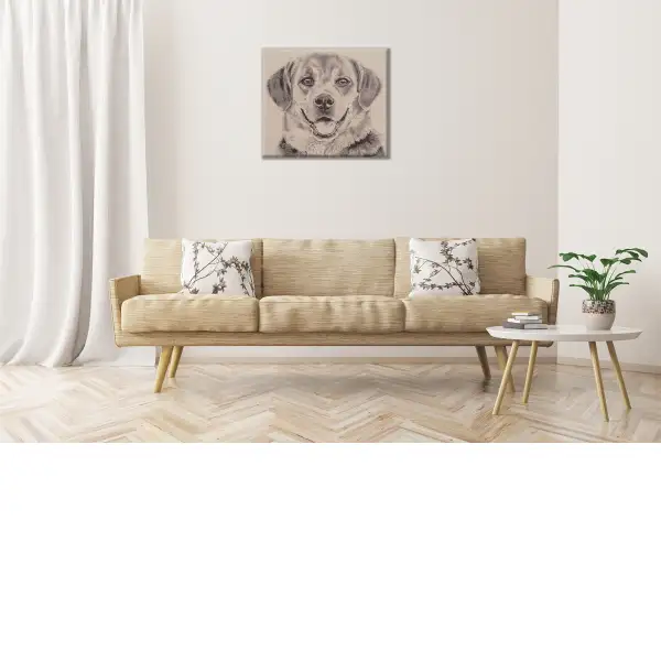 Happy Canine is a wonderfully ornate monochromatic stretched tapestry wall panel of a happy puppy with eyes full of wonder and mischief, bring this piece into your home today and add that sense of "awe" that has been missing.