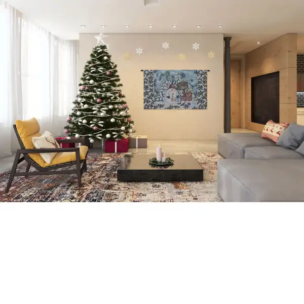 Holiday Snowman is an Italian jacquard wall tapestry. This cheerful holiday tapestry shows a snowman next to a mailbox and presents in a winter wonderland. Holly Sprigs form a border on the left and right.