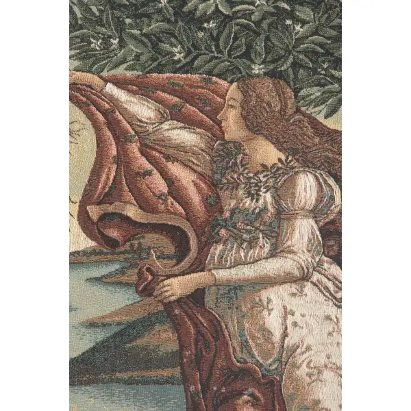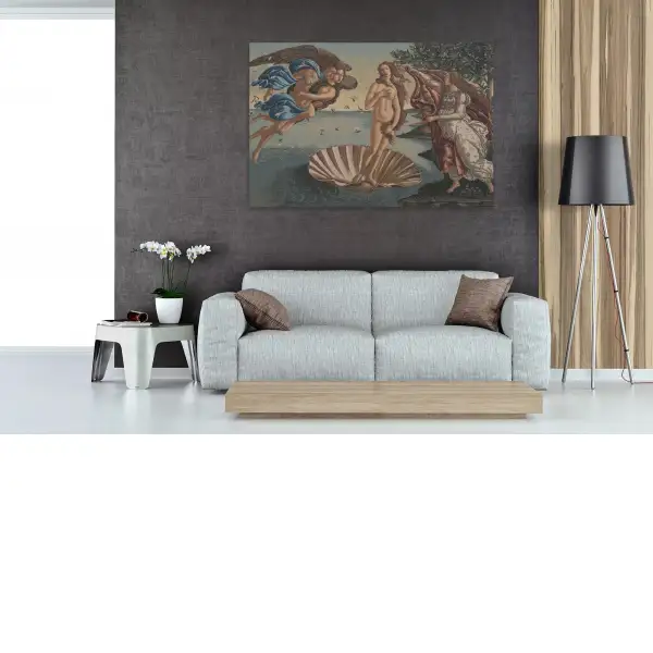 Birth of Venus- Boticelli is a Belgian made jacquard woven wall tapestry. The original artwork comes from the painting, the Birth of Venus, created by Sandro Botticelli. It portrays the goddess Venus emerging from the sea in her clam-shell. It is believed to have been commissioned by Lorenzo di Pierfrancesco de'Medici for his Villa di Castello. Others speculate that it was painted in honor of Simonetta Cattaneo Vespucci, a love of both Giuliano di Piero de' Medici and the artist Botticelli, who lived in a seaside town that revered the Venus. Those who favor this story believe that Simonetta herself was the model for Venus.