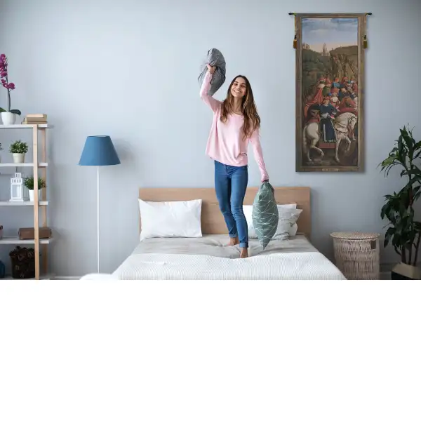 The Just Judges I or The Righteous Judges is a Belgian jacquard wall tapestry portraying the lower left panel of the Ghent Altarpiece, also called Adoration of the Mystic Lamb, painted by Jan and Hubert van Eyck circa 1432. It is believed that the panel shows portraits of several contemporary figures such as Philip the Good, and possibly the artists Hubert and Jan van Eyck themselves. The panel was stolen in 1934 and has never been found. At that time the altarpiece represented a new conception of art, in which the idealization of the medieval tradition gave way to an exacting observation of nature and unidealised human representation.