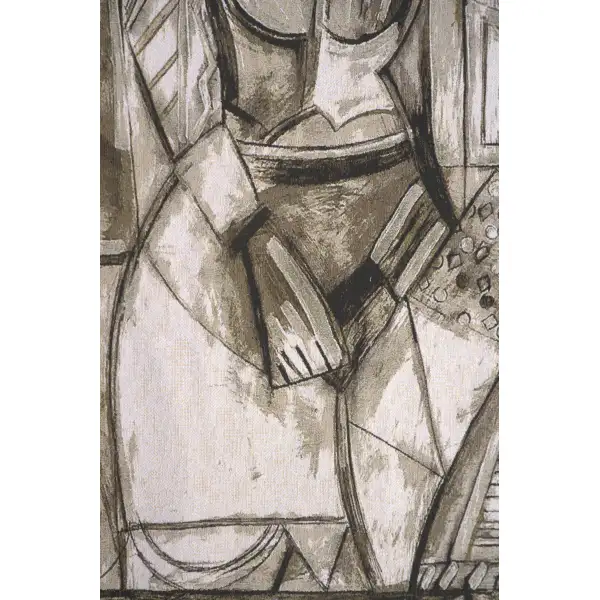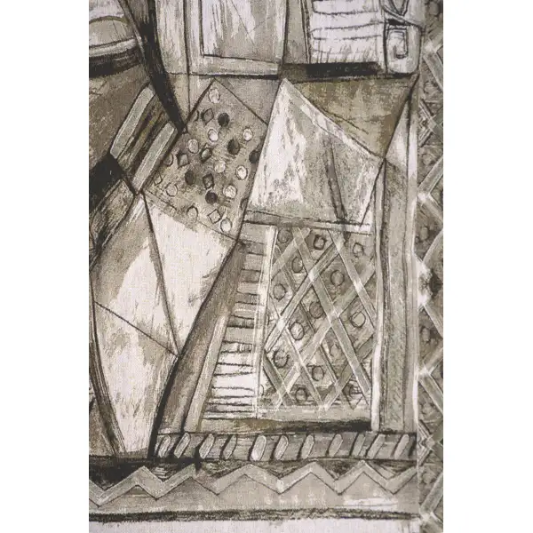 "Kariatide II" is a striking Belgian tapestry, meticulously jacquard woven with precision and care. This decorative piece boasts abstract geometric art in a monochromatic scheme. At its heart lies a captivating portrayal of a female form, her hands gracefully clasped in front of her, amidst geometric columns and architectural accents. Reminiscent of the ancient Greek architectural motif, the caryatid, this tapestry pays homage to the classical tradition where sculpted female figures supported building structures. The intricate design merges contemporary elegance with historical resonance, offering a timeless and sophisticated addition to any space.