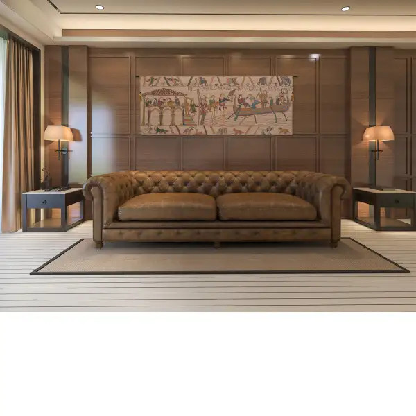 Here, the Latin inscription ECCLESIA, HIC HAROLD MARE NAVIGAVIT ET VELIS says that Harold prepares for his trip. He enjoys his last meal before taking the open sea in direction of Normandy. A marvelous addition to your home décor motif.