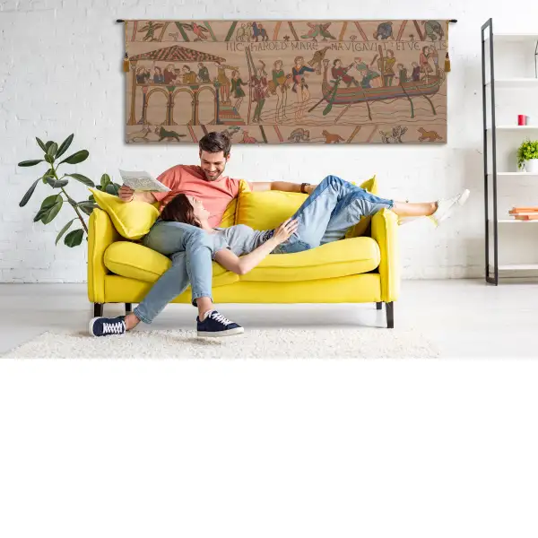 King Harold Small, French impressionist jacquard woven tapestry wall hanging depicts events leading up to the Battle of Hastings (1066) when Duke William of Normandy was victorious over King Harold of Saxony, England. This is an extract of the queen Mathilde's tapestry. The original some 230 feet long, is in the Bayeux museum in Normandy. It describes how England was conquered by Normans. Also known as L'Embarquement.