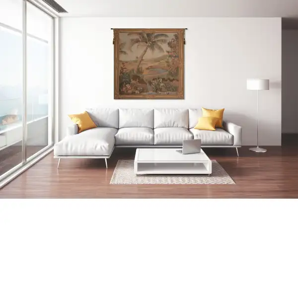 L'Oasis Carre is a jacquard woven wall hanging tapestry inspired from the famous Tentures des Indes, set of 8 tapestries woven at the Gobelins during the 17th century. The original artwork was designed by Albert Echhout and depicts the exotic flora, fauna and natives of the Dutch colonies. These tapestries met with great popularity in the 18th century.