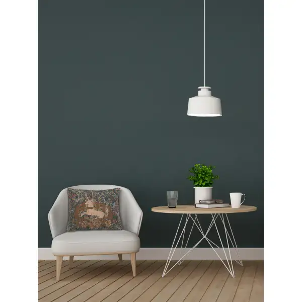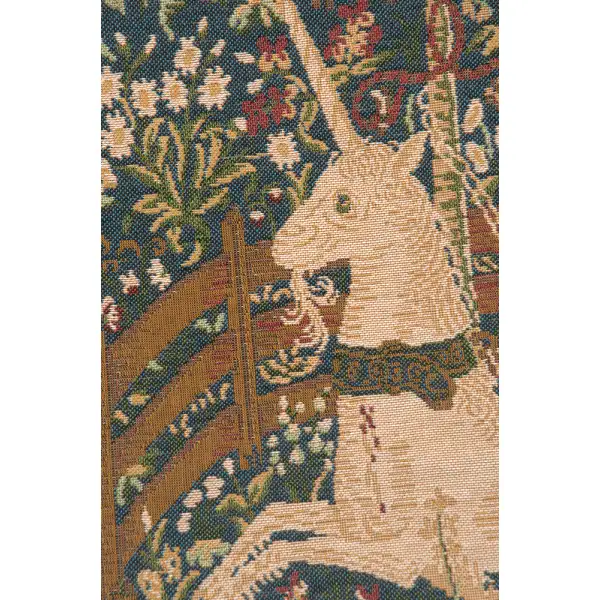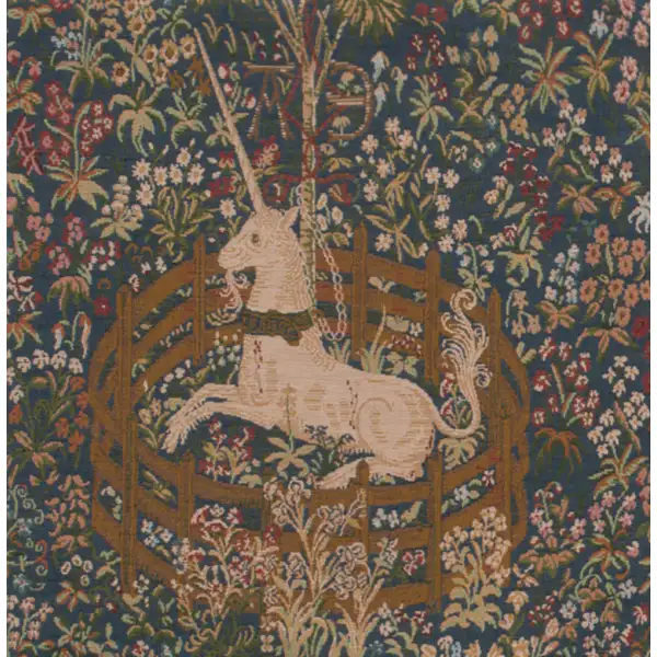 La Licorne Captive I, is a European jacquard woven tapestry cushion cover. The art comes from a set of medieval tapestries called, Chasse a la Licorne, or The Hunt of the Unicorn.