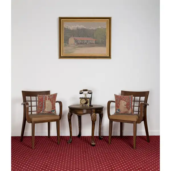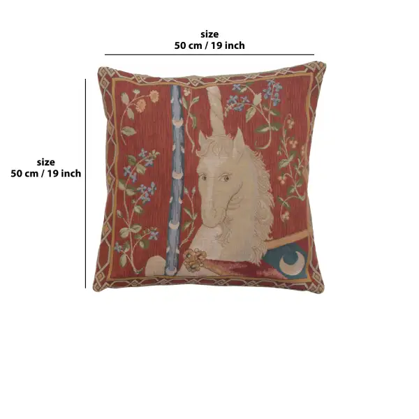 This European jacquard tapestry cushion cover, La Licorne, or The Unicorn is an extract from the famous set of 6 medieval tapestries Lady and the Unicorn. Woven in about 1511, they feature the arms of Jean le Viste and are now housed in the Cluny Museum, Paris. Companion piece to this is #897 Le Lion Medieval.