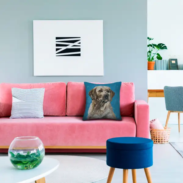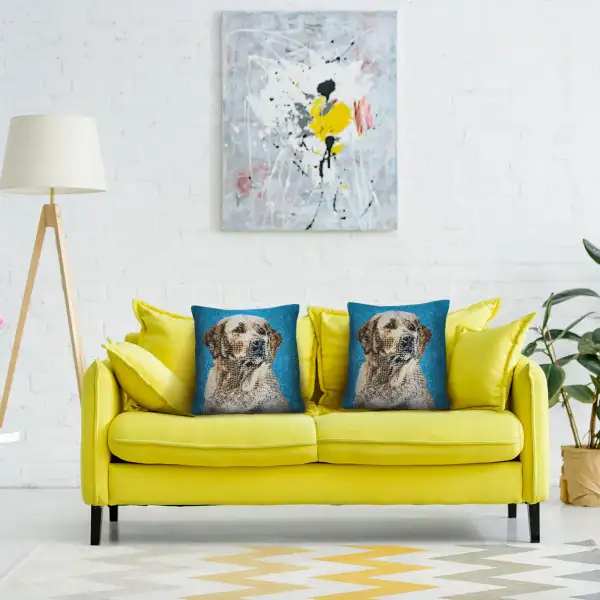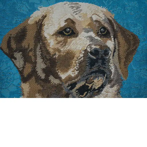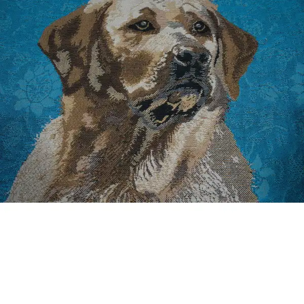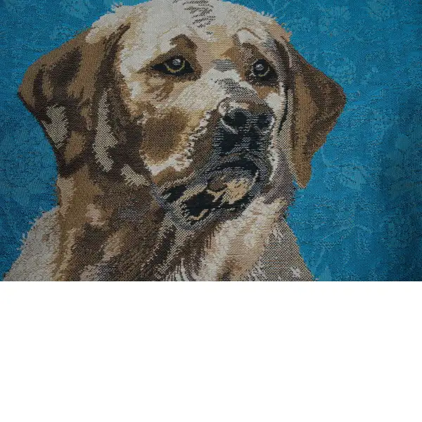 This Jacquard woven cushion cover boasts a captivating scene with a yellow Labrador set against a tranquil teal blue background. The Labrador takes center stage with its endearing soft eyes and a gentle expression, imparting a sense of warmth and charm. With the blue background, the intricate weave skillfully incorporates subtle delicate flowers and vines. The fusion of textures and colors creates an aesthetically pleasing composition, making this cushion cover a tasteful addition to any space. The meticulous craftsmanship of the Jacquard weaving technique enhances the overall visual appeal, elevating the cover beyond a mere decor item to a piece of art that effortlessly combines style and comfort. Embrace the sophistication of this Jacquard-woven creation, where the Labrador's presence adds a touch of grace to your living environment.