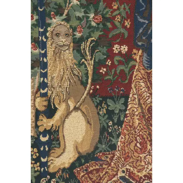 The lady plays a positive organ on top of a table covered with a Turkish rug. Her maidservant stands to the opposite side, and holds the organ in place. The lion and unicorn once again frame the scene holding up the pennants, but in this scene, their positions are reversed so that they are inside the frame, and each is on the opposite the side of the lady that they are on in all the other tapestries.