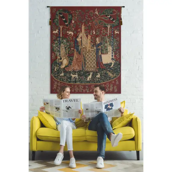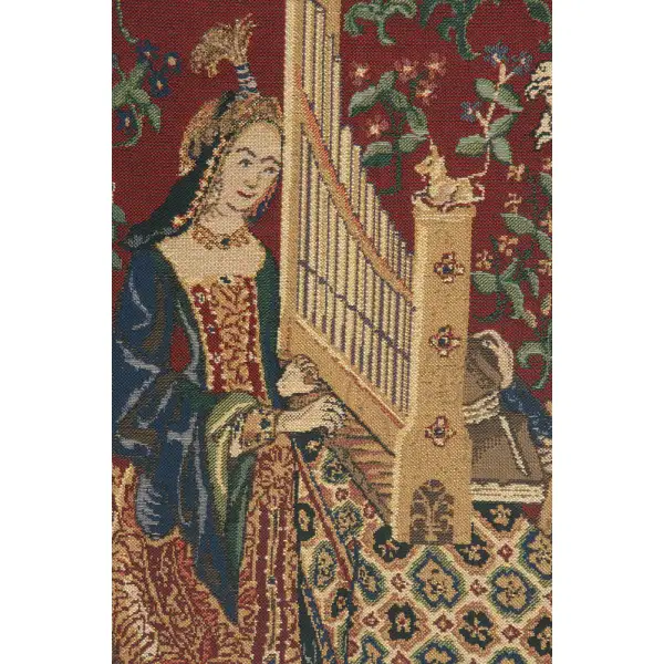 Lady and the Organ II Belgian tapestry is one of the six tapestries in the "Lady and the Unicorn" series. This tapestry represents the sense of hearing.