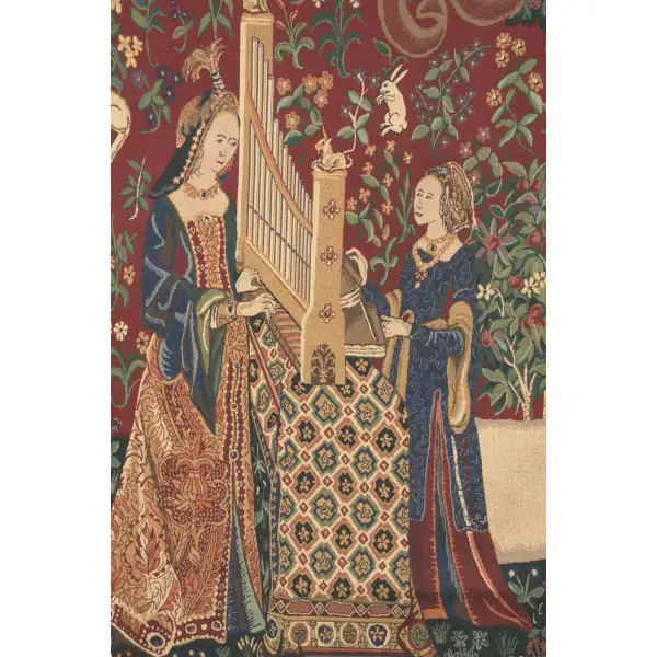 This beautiful tapestry encompasses three different scenes portraying three of the senses. Hearing, touch and taste.