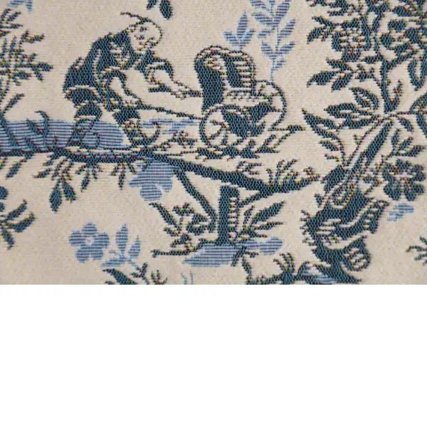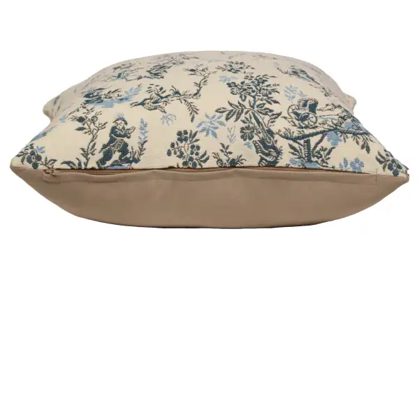 Immerse yourself in the refined beauty of French decorative arts with our jacquard woven cushion cover, showcasing the enchanting scene of "The Chinese on a Wheelbarrow" in classic blue on white Toile de Jouy tapestry. The scene, depicted with meticulous detail, transports you to a bygone era, where figures in traditional Chinese attire converse amidst a serene backdrop. Against delicate blue foliage on a crisp white canvas, the scene emanates tranquility and sophistication.