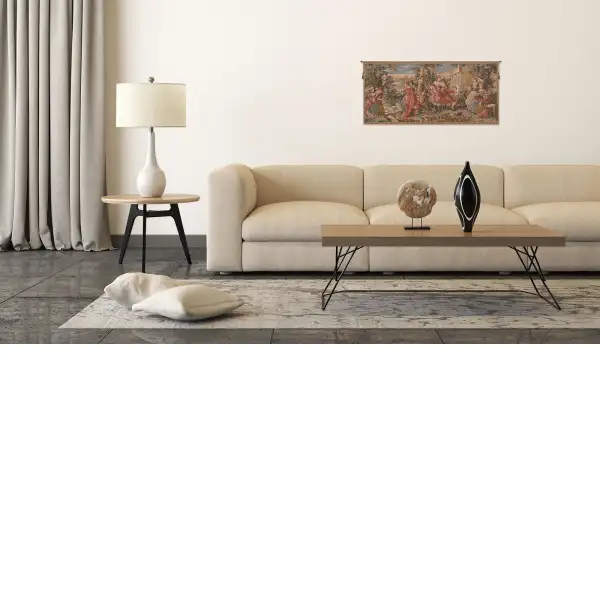 Dejeuner Champetre, is a French impressionist jacquard woven tapestry wall hanging inspired by the works of Francois Boucher (18th century). This jacquard wall tapestry represents a garden party celebration with the indulgence of food and wine.