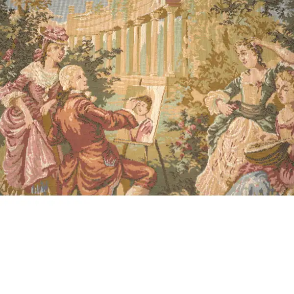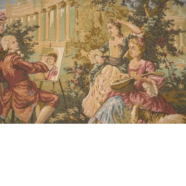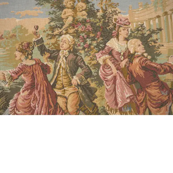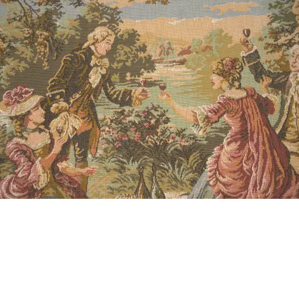 Dejeuner Champetre, is a French impressionist jacquard woven tapestry wall hanging inspired by the works of Francois Boucher (18th century). This jacquard wall tapestry represents a garden party celebration with the indulgence of food and wine.