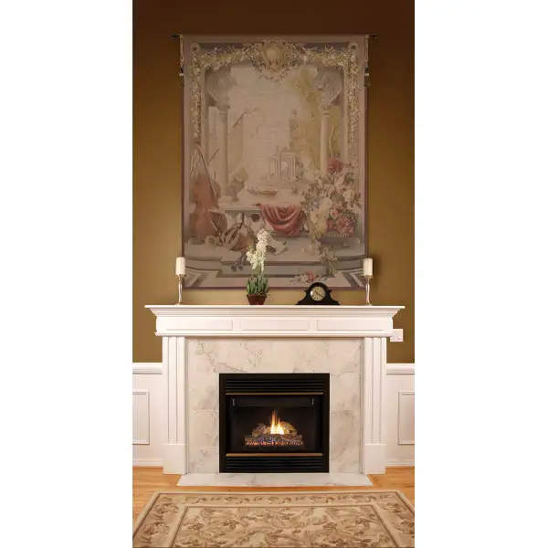 This jacquard wall art tapestry has has a garland of flowers on the top, in the foreground a magnificent bouquet next to a set of instruments. The background features The Port of Tuscany.