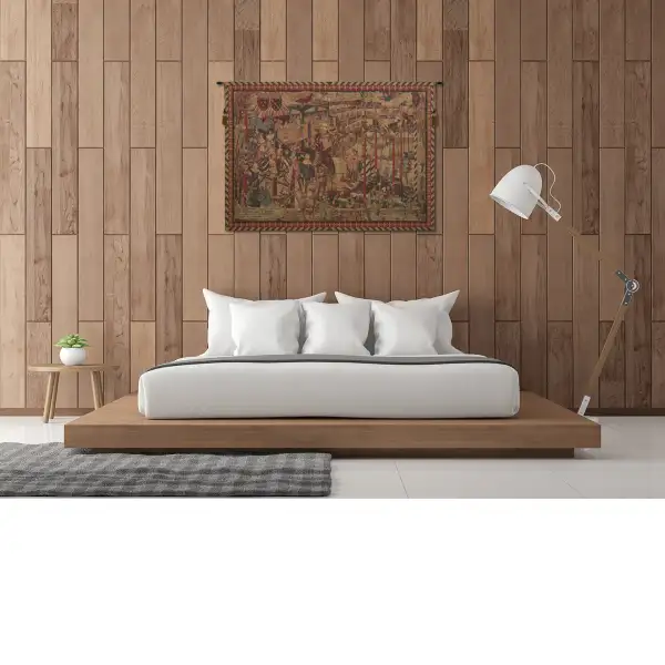 This jacquard wall hanging tapestry, Le Tournai, or The Tournament is a reproduction of an 1895 oil painting by Jean-Paul Laurens, titled; A Tournament Scene At the end of the 15th Century. A faithful interpretation of the original oil painting was woven at the Royal Manufacture of Gobelins from 1895 to 1899. Highly stylized, this epic composition can be compared with the sumptuous middle-ages frescoes.