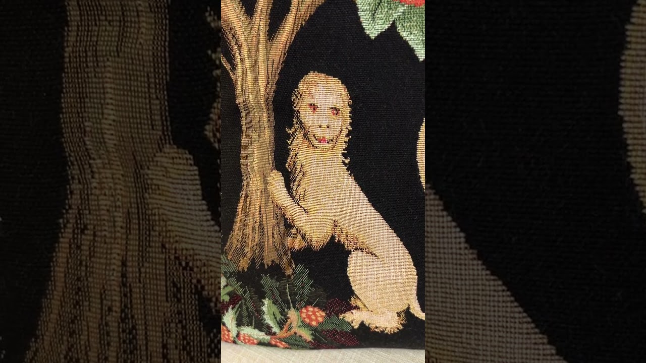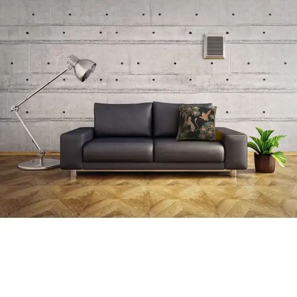 This design transports you to a medieval realm, where a majestic lion reigns over an orange tree, his paws gracefully resting on its branches. The lion's gaze fixates on a pheasant in flight, capturing a moment frozen in time. Surrounding them, a forest of trees made up of shades of green, brown, and orange further enhance the narrative, while a deep, enchanting black forms the backdrop, infusing the composition with a sense of mystery and sophistication. This playful lion, enchanting forest, and soothing palette of colors, adds a touch of magic and whimsy to any space. It's a delightful accent that sparks imagination and creates a cozy, enchanting atmosphere.