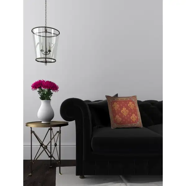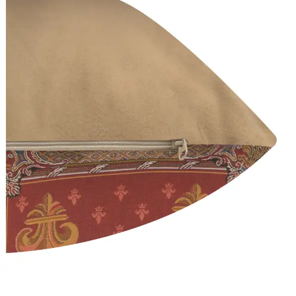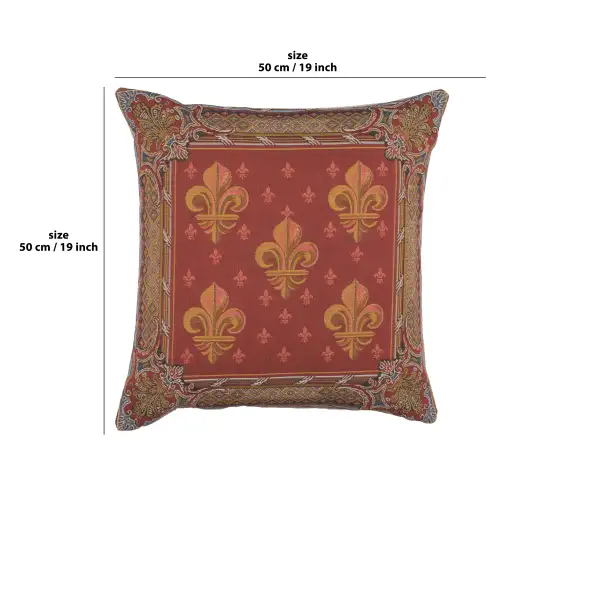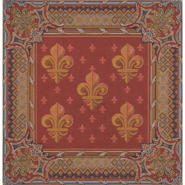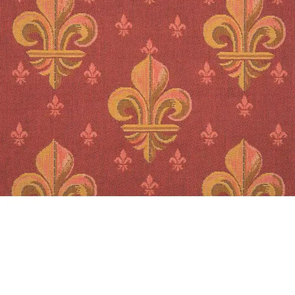 This jacquard cushion cover features five fleur de lis (plural) in a symmetrical pattern amidst a red backdrop with many smaller fleurs as an accent. The fleur de lys is a stylized lily used in various forms of art and banners that dates back to the medieval era.