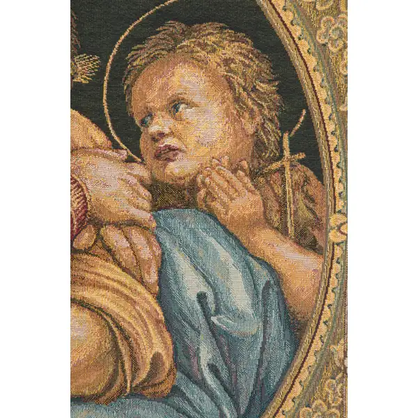 Madonna Della Seggiola is an Italian jacquard woven wall tapestry. The artwork comes from the Italian renaissance artist Raphael, dating to c. 1513-1514. The original painting is housed in the Palazzo Pitti collection in Florence. It depicts Mary embracing the child Christ, while the young John the Baptist devoutly watches.