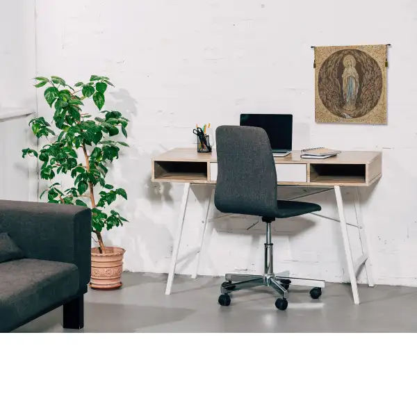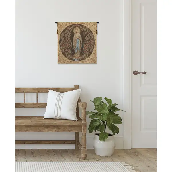 Apparitione Lourdes Italian woven tapestry features an apparition image of the Blessed Virgin Mary as described by Saint Bernadette Soubirous, a 14-year-old miller's daughter from the town of Lourdes in southern France.