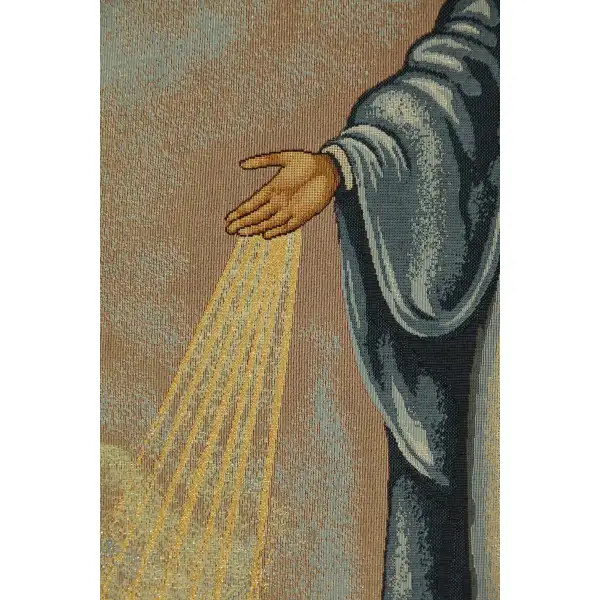 The Madonna Miracolosa Tapestry presents an enchanting textile portrayal, depicting the Madonna amidst celestial clouds. Draped in robes of blue and white, adorned with a golden head covering, she emanates divine beauty, accented by a halo of stars. Light beams extend from her hands, symbolizing blessings, while she gracefully steps on a serpent, signifying victory over evil. Handcrafted in Italy with meticulous care, this tapestry blends cotton and viscose, intricately adorned with shimmering gold thread accents. Its durable yet luxurious construction ensures longevity and sophistication, enhanced by practical features such as a lined back and tunneled top for easy installation. Seamlessly fitting into any space, it captivates viewers with its radiant golden hues, embodying both grace and resilience.