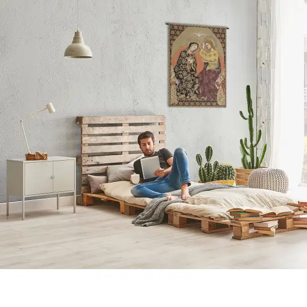 Madonna's Coronation is an Italian jacquard wall tapestry. The art comes from the original painting Coronation of the Virgin (c. 1420) by Gentile Da Fabriano (1370 – 1427), an Italian painter known for his participation in the International Gothic painting style.