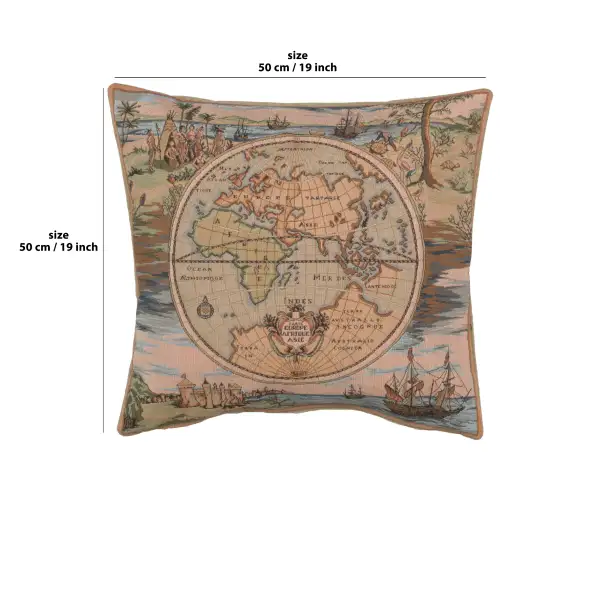 Map of the World - Europe, Asia, Africa is a European jacquard woven tapestry cushion cover featuring an antique map of the world and a detailed background with scenes from the old world and new.
