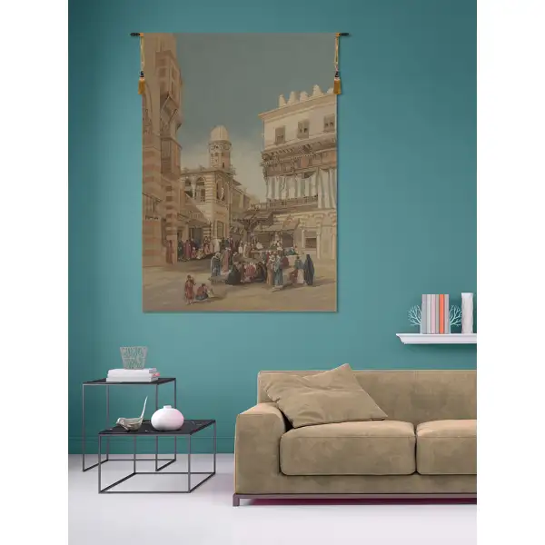 Nahaseen tapestry depicts a scene from the Khan el-Khalili Market in Cairo, Egypt. This market has been around since the 14th century and is not just a tourist market. It is a fascinating mix of souvenirs, handmade craft, jewelry, exotic clothing and contains many restaurants and cafes where you can sit and watch an interesting mix of cultures. The narrow alleyways of shops twisting this way and that give visitors an insight into what medieval markets must have looked like.