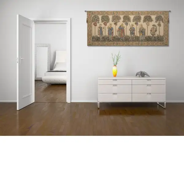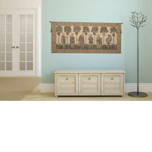 Master of the Castle I is an Italian jacquard wall tapestry also known as I Nove Prodi, or the Nine Worthies. This tapestry is an adaption of the original fresco from the Master of La Manta (1420) an anonymous master, painted in the sala baronale of the Castello della Manta, Saluzzo, Italy. The series includes depictions of nine historical, scriptural and legendary personages who personify the ideals of chivalry as were established in the Middle Ages and their female counterparts. The best known character Godfrey of Bouillon who led the first Crusade from 1096 till 1099. He was proclaimed King of Jerusalem in 1100.