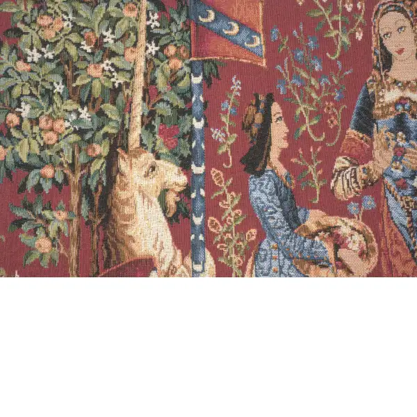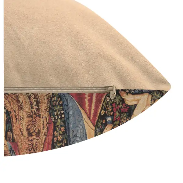 Medieval Smell woven European tapestry cushion cover features one of the scenes from the "Lady and the Unicorn" series of Belgian tapestries.