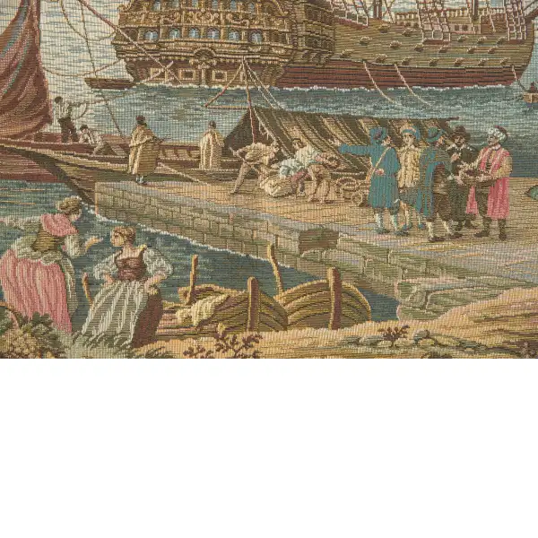 The artwork comes from an 18th century painting by Francesco Guardi detailing merchants waiting for arrival of the ship at port. The city of Venice originated as a collection of lagoon communities banded together for mutual defense from the Lombards, Huns, and other invading peoples as the power of the Western Roman Empire dwindled in northern Italy. This tapestry gives us a historical view of the harbor of the ancient city.
