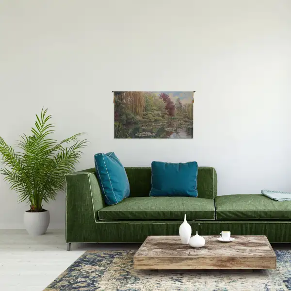 A Belgian wall tapestry scene from Claude Monet's gardens at Giverny. Monet's garden is much today as it was when he painted his famous lake Giverny, as reflected in this group of tapestries. This tapestry compliments any home decor motif.