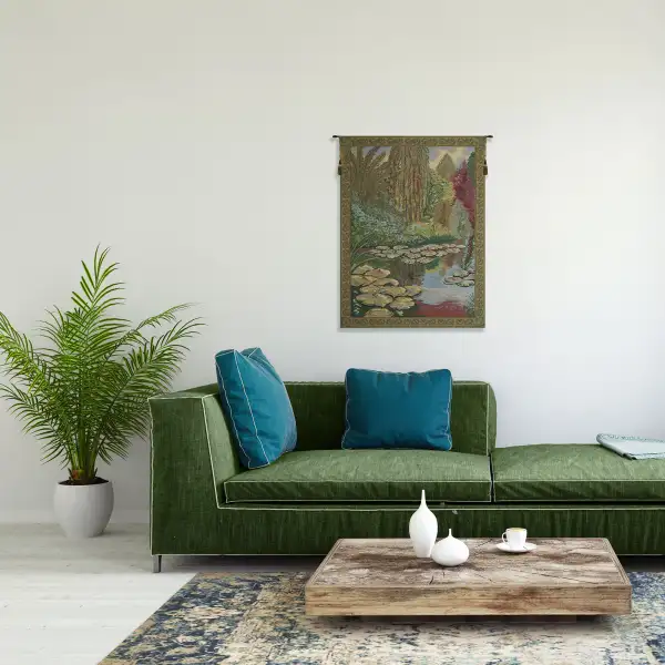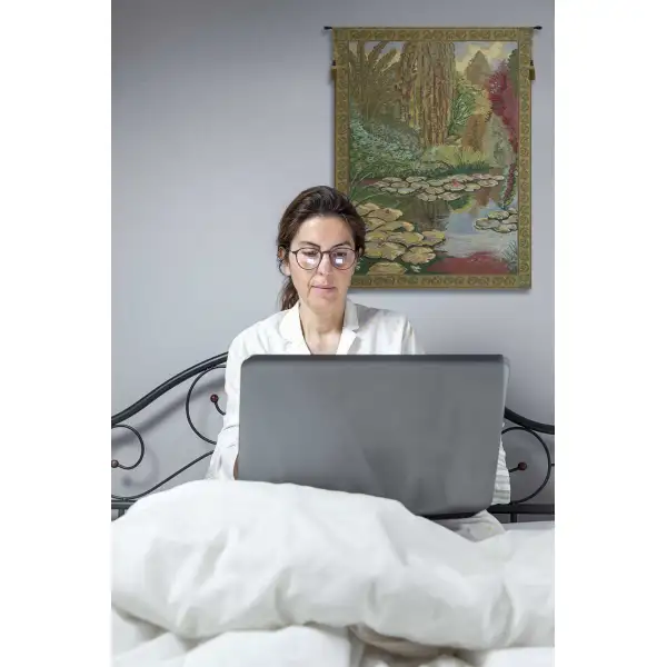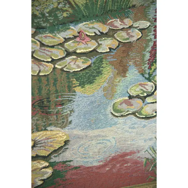 Monet's Ville de Vertheuil Belgian tapestry features the work of painter Claude Monet. Monet's Ville de Vertheuil tapestry is a striking composition of the garden of Claude Monet in Giverny, France. Featured is a pond with gently floating lily pads.