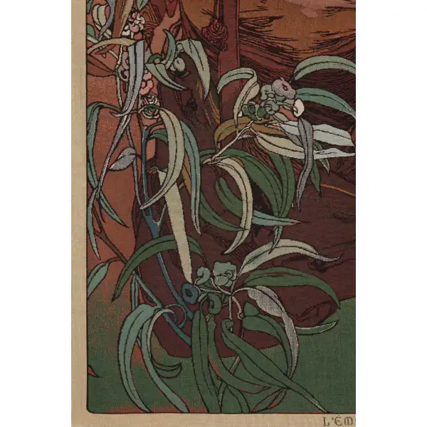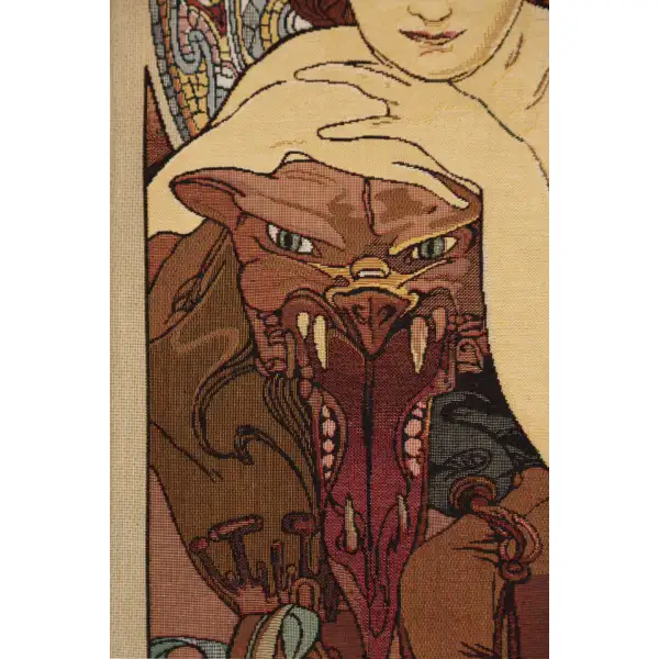 This mesmerizing tapestry draws inspiration from Mucha's celebrated "The Precious Stones" series, specifically highlighting Emerald, or "L’Emeraude." The artwork portrays a captivating scene featuring a woman in a rich burgundy gown, seated gracefully with folded arms. Her emerald-green eyes command attention, while she delicately rests her arms atop a dragon, evoking a sense of mystique. Intricately styled hair adorned with a serpent-shaped ornament adds symbolic allure. A backdrop of stained glass-style mandala lends an ethereal beauty, complemented by lush greenery in the foreground, creating a serene ambiance. This composition masterfully captures the essence of Mucha's style, blending elegance, symbolism, and natural beauty in a harmonious tapestry.