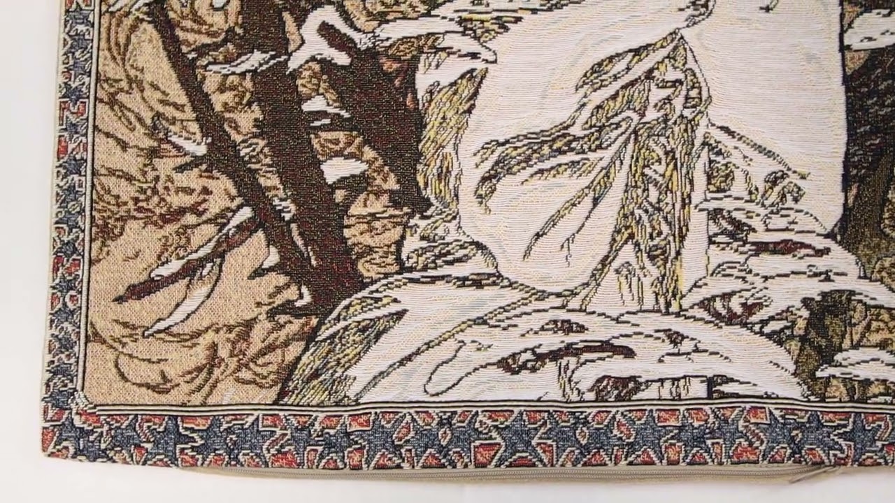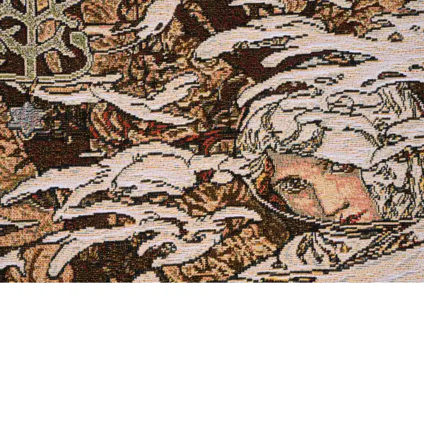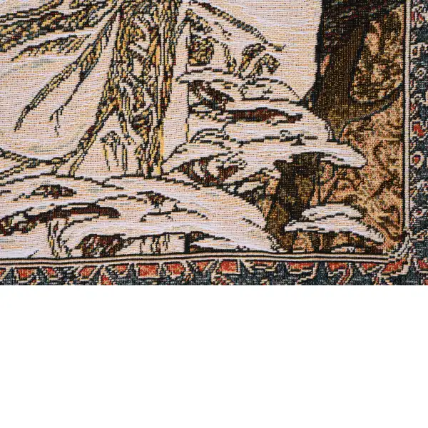 Protecting herself from the encroaching elements, the figure in “Art Nouveau-Winter” personifies the season of winter. The scene is set in a forest, the barren tree losing the last of its leaves. The bold, sweeping lines and intricate detail are highlights of the Art Nouveau style of art, which only lasted about 30 years, but remains one of the most readily identifiable styles in contemporary art. This tapestry is based on the work of Alphonse Mucha (1860-1939), a Czech artist who lived in Paris. Mucha was one of the pioneers of Art Nouveau, creating several seminal works, including his highly prized Panneaux, a series of works designed around a single theme. “Art Nouveau-Winter” is a fine example of his Panneaux.